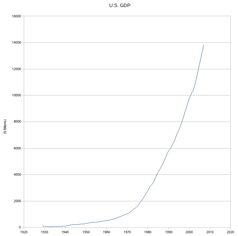 The following graph looks at US GDP from 1930 to 2010. An amazing story. Look how steep our raw growth has been.
