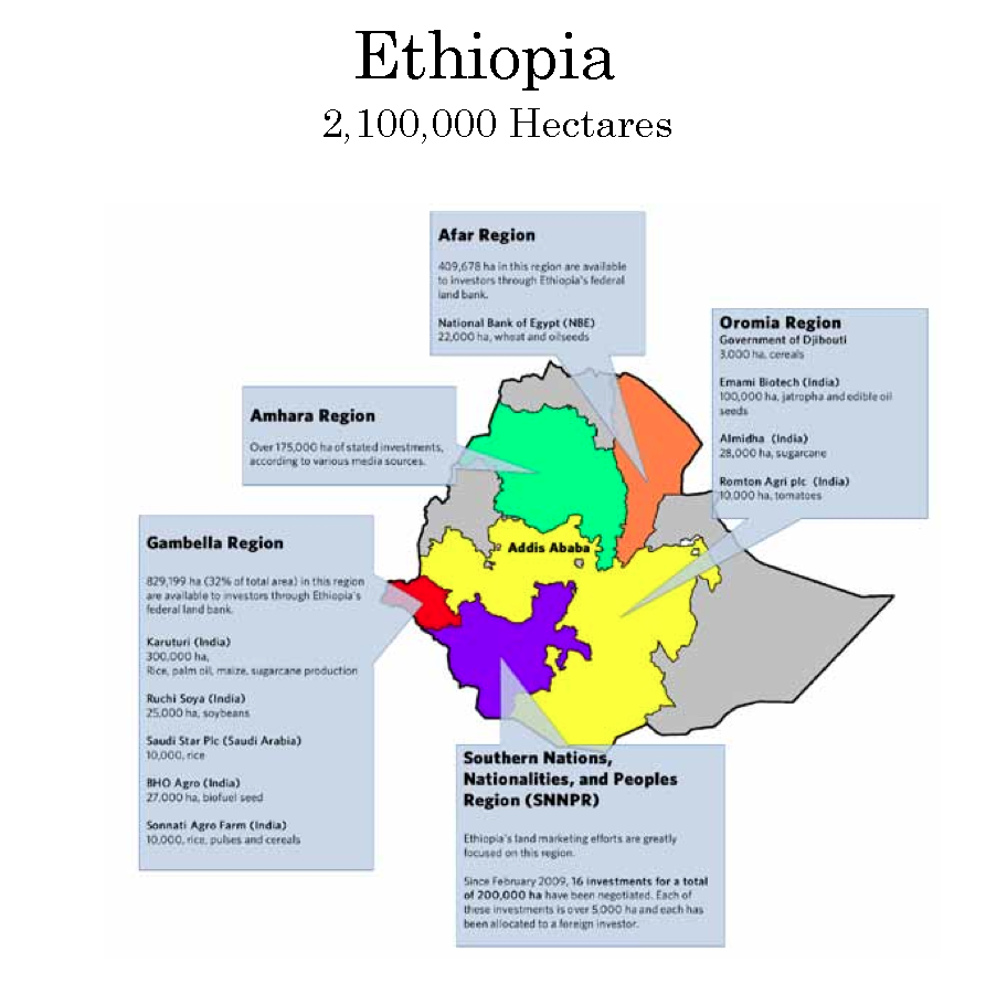 In Ethiopia, Karuturi initially received land for just $1.25 per ha, the rate was later raised to $ 6.75 per ha. In comparison, rates for Brazil or Argentina are $5,000-6,000 per ha.