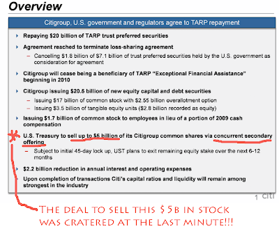 The lies floating around this issue are unbelievable. This is like a junior mining pump and dump. All with gov't collusion at the highest levels. The best lie was it was 17x oversubscribed, even before the price was set. Fuck off. 17x $20 Billion is $340 Billion. Making it the biggest capitalized bank in the world. More realistically, there was no where near enough demand, which is why the price was slashed and the gov't had to cancell their sale. Instead of bragging about their profits, Treasury will likely lose a ton, and maybe, just maybe, somebody might get fired. An out and out junior mining scam.