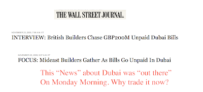 If Ben and Timmy cannot stop the dollar carry trade with their last remaining piece of wet spaghetti, why wouldn't they help manufacturer a crisis that creates demand for dollars, however temporary? The Dubai default has been coming for a year and isn't news to bankers, so the official announcement of restructuring is merely a statement of the obvious. So, what is the agenda served here? Burning the dollar shorts and gold longs in order to dampen speculative excess...just as they have with stocks in bringing VIX from ~80 to 20. The dance will be to crush the dollar shorts and carry traders without crushing the US stock market bubble...er, recovery.