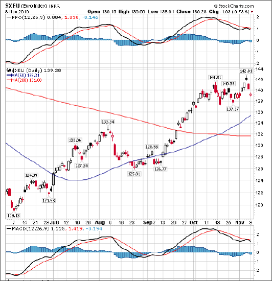 After the initial reaction regarding QE2 where the euro approached 1.43 on the Eeuro/Dollar currency cross, it is now hovering just above 1.38. It seems very likely that euro could break through the 1.38 level this or next week, and head much lower to around 1.35 over the next month on European debt concerns, which will be back on the front burner as markets focus away from the US and back on Europe.