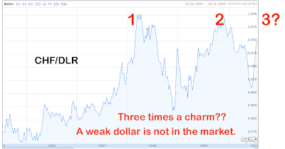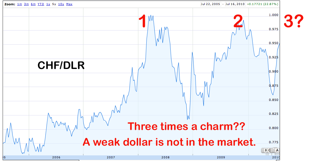 This chart shows that the CHF is now worth about 95 cents US. It show that the Franc has touched on parity twice in the past few years. So we understand eachother. I think the CHF will rise in value and go to parity.