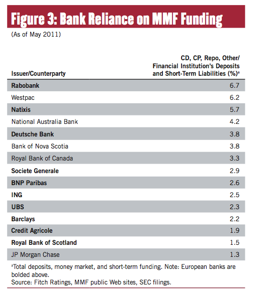 That may not be the case. Fitch did another of its reports on US Money Market exposure to European banks. (Link to Fitch, but you have to sign up to see the info) . From the report: