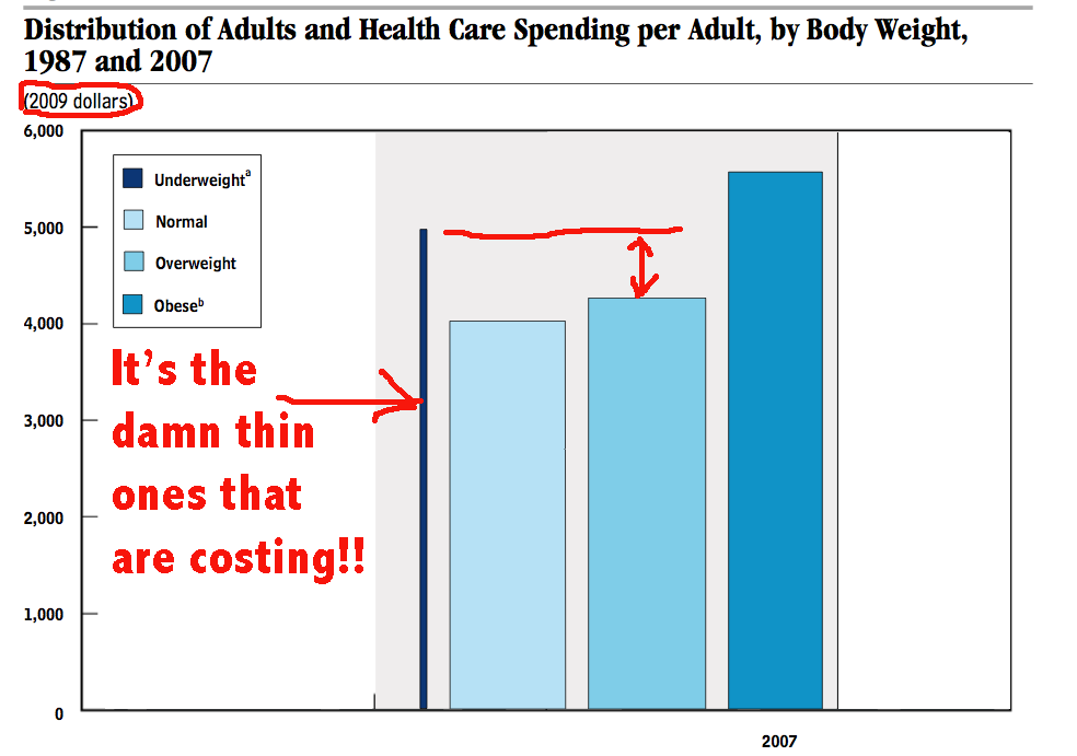 I've never seen such a mish mash of abused statistics. It's hard to even know where to start in attacking this pile of garbage. First off, underweight individuals are usually underweight because they are dying of someting, usually cancer. That does skew statistics doesn't it? Their number is very small meaning the total cost to the system is small. 60% of Americans are obese and these individuals carry nearly double the risk of diabetes, heart disease, PADs, colorectal problems etc. as normal weights. These dieseases are costing us a bundle. Is the Author obese or just ignorant?