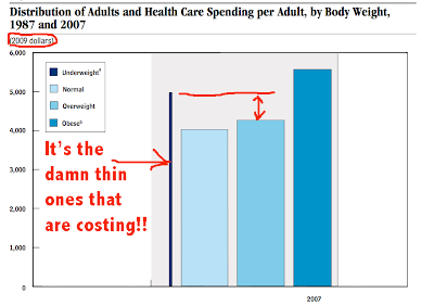 overweight or a person who is underweight? Surprise, surprise. Underweight people have higher health care bills than do the overweight set. Possibly the press should start doing belly shots of all those skinny folks (instead of the fatties they always have on).