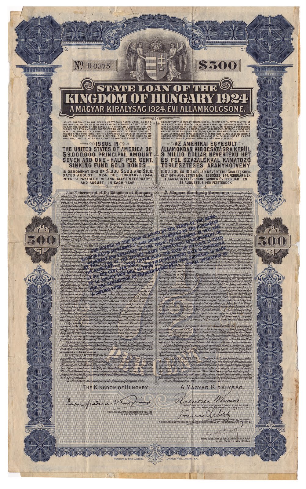 As you can see this is a $500 Hungarian bearer bond issued in 1924. It