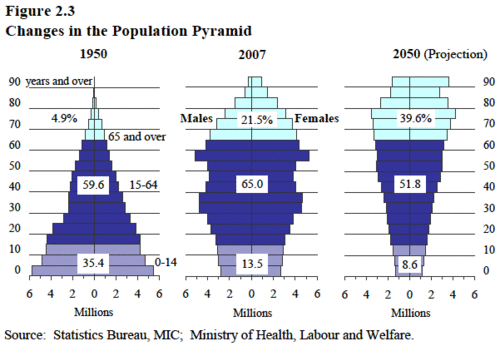 2) Now look at the world's worst population pyramid, that for Japan. These graphs show that a nearly perfect pyramid drove a miracle stock market during the fifties and sixties which I remember well, when Japan had your textbook high growth emerging market economy. That changed dramatically when the population started to age rapidly during the nineties. The 2007 graph is shouting at you not to go near the Land of the Rising Sun, and the 2050 projection tells you why. By then, a small young population of consumers with a very low birth rate will be supporting the backbreaking burden of a huge population of old age pensioners. Every two wage earners will be supporting one retiree. Think low GDP growth, huge government borrowing, deflation, and a terrible stock and housing markets. If you are wondering why I am aggressively shorting the yen right now, this is a big reason. Dodge the bullet.