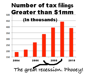 again about how terrible it was during the deep recession of 2007-2009. Nonsense. The number of people filing big-ticket returns never dipped. It steadily rose.