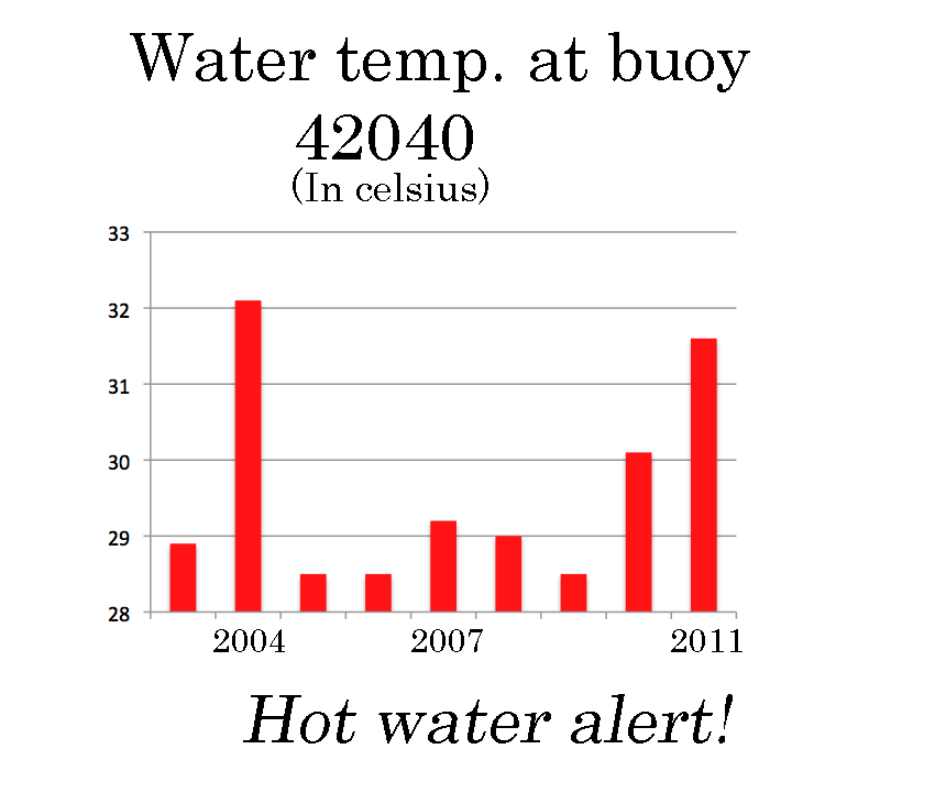 I did get some partial data from a nearby buoy #4204. A comparison of water temperatures over the past eight years: