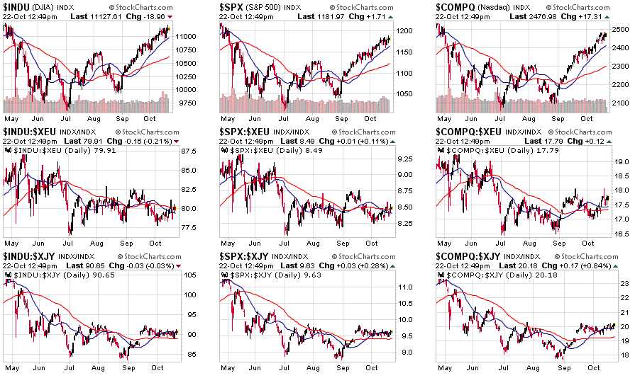 That is just sad, isn’t it? But not as sad as the MSM in this country cheerleading stocks and the market as if they are "en fuego" when they are, in fact, LOSING ground to the declining dollar. October alone has seen a 5% drop in the dollar and only the Russell has managed a 5% gain. This is interesting because small-cap, relatively local companies benefit the least from the declining dollar but we haven’t gotten a lot of Russell earnings yet as the S&P had the floor last week so it will be interesting to see what holds up as the smaller companies begin reporting their earnings.