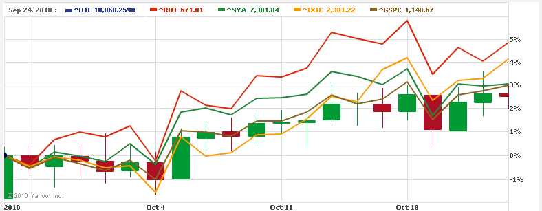 The same goes for the people selling cars and clothing and even beloved IPods - if you are collecting the same amount of money but getting paid in what is effectively Monopoly money - are you really doing well? Now, where was I? Oh yes, data! Wednesday we get to see if anyone applied for a Mortgage last week and at 8:30 we get Durable Goods Orders, which should be up as we sold the Saudis a bunch of WMDs in the form of fighter jets. At 10am we get New Home Sales and, of course, Oil Inventories at 10:30. Thursday another 450,000 pink slips will be handed to US workers but, more importantly, on Friday we get the Q3 GDP where bad news will be good news for those who pray for QE2. We also get the Chicago PMI and Michigan Sentiment on Friday and, of course, then we head into the election so fun, Fun, FUN!