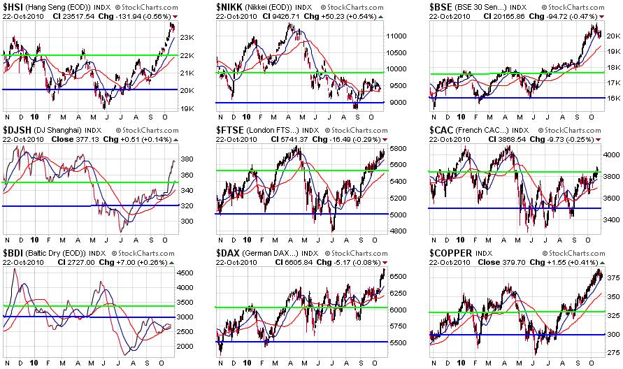 With this global gathering of market movers, I guess we’d better get a global perspective on the markets, right? Let’s take a look at our global multi-chart and see how we are doing. The blue lines are our mid-points and the greens are the 10% lines and they reveal an interesting pattern: