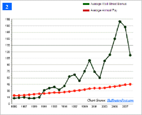 Meanwhile, the average Wall Street bonus soared almost 14 times higher (by 2006); the average worker's salary has essentially been stagnant sine the mid-1980s. (Chart 2)