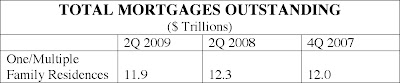 The total size of the mortgage market has been flat for a year. In its June report the Federal Reserve reported that the total market had declined from $14.68 trillion at year end 2008 to 14.60t. in March of 2009. The following looks at the moving deck chairs on this Titanic. The data comes from the June FRB Mortgages Outstanding report. This is March data. I have reviewed individual data from June 30th. I believe that the trends evident in the FRB report are continuing today.