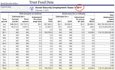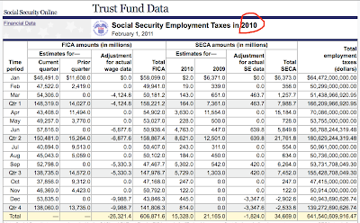 ADP has been off for the last few months. This SSA data shocked me. The Jan 2011 Total FICA is tracking below the 2010 number. I don't understand how this is possible. There are about 1.5mm NET new workers in the workforce, personal income have grown over the last year and there has been been employment growth. How is none of that growth showing up in payroll receipts?