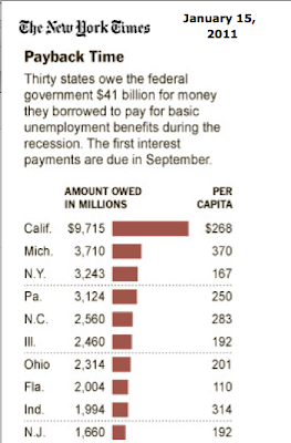 Fast-forward a few months...as far as I know CA is still borrowing away, because the unemployment rate remains sky-high. But you wouldn't know about it from the coverage of the state budget. I also don't recall our new/old Gov. Brown mentioning the looming September repayment or anything along the lines of "we cannot keep borrowing over $10 billion per year to cover unemployment". (If someone heard him mention it anywhere, please provide a link).