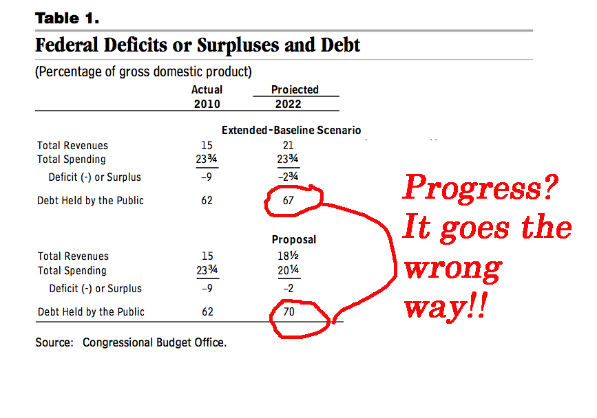 I hate all the plans. I don't think the administration has a plan. The current "plan" is the one the CBO refers to as the Baseline. Call that the administrations plan. Look at the raw results from the table. There is no defict reduction in the early years of this 40 year plan.