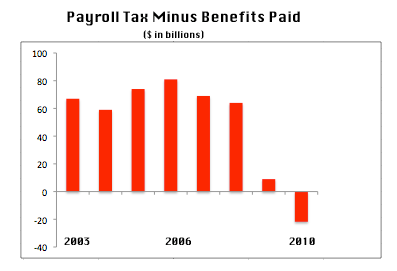 You can roughly gauge how Social Security finances are doing month to month by looking at the Treasury MTS statements, Table 6, schedule D. These tell you the amount of Treasuries purchased by the individual off-budget funds, in comparison to the same period of the previous year. Through August, the first 11 months of FY10, the Social Security trust fund bought $41b fewer Treasuries than in the same period of FY09. The Federal Disability trust fund bought $11b fewer Treasuries. Add those, multiply by 12/11 and you get a rough deterioration of $57 billion in FY10 vs FY09, when the combined funds ran a surplus of $3.5 billion.