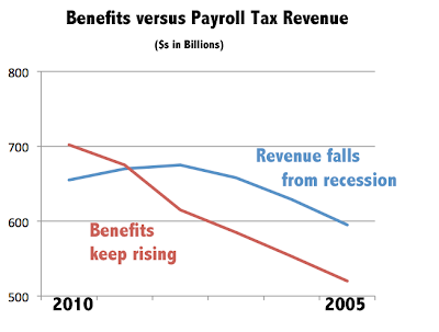 This graph shows exactly why they raised the SS deduction in the 80s. They could tell back then we needed the surpluses to cover the retirees now, in 2010.
