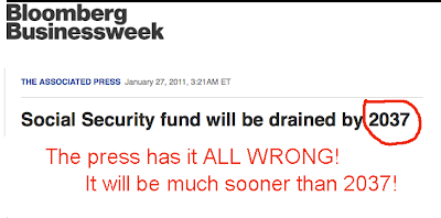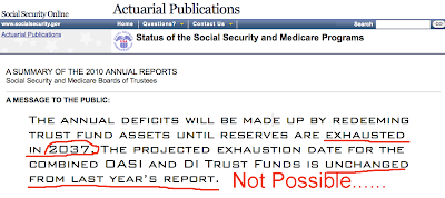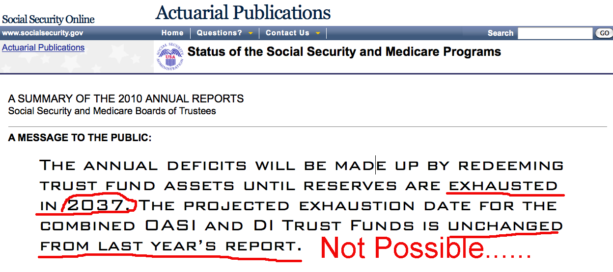 ----- We planned on this to happen in 1983, when we raised the social security withholdings. Back then, they forecasted we would turn the corner in 2010, which isn't too bad considering the state of the economy the last two years. This tax increase led to large SS surpluses. These surpluses would have covered the SS deficits for decades from now. I know it's hard to believe, but the fucking government SPENT every last dollar of the surpluses and replaced them with WORTHLESS IOUs. The government cannot and will not pay off any debt, including what they owe to SS. It's just not gonna happen.