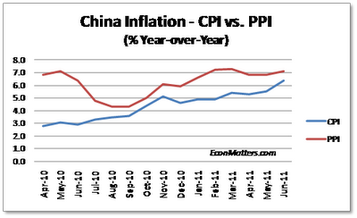 Meanwhile, China's Producer Price Index (PPI), measuring inflation at the wholesale level, rose 7.1% year-on- year in June (See Chart Above), mostly due to production materials costs which were up almost 8% in June.