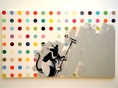 That piece is a dig at tosspot Damien Hirst, remember the diamond skull he tried to sell a few years ago. Hirst used to get his assistants to colour in these dots with pastel colours, I think they were color-coded phamacutical compounds. Fin de siecle mas-debation. Time's up Daymo.