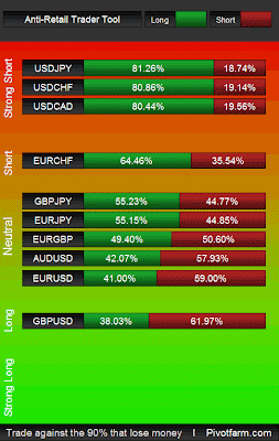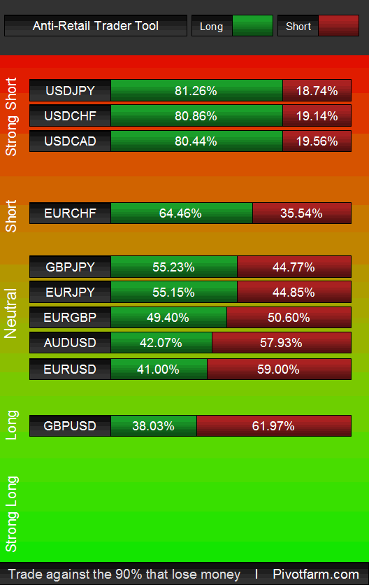 A slew of potentially market moving and thus retail position moving events today, EUR CPI is released at 05:00 EST, CAD GDP at 08:30 EST (big mover), 09:45 and 10:00 are the USD Chicago PMI and Pending Home Sales respectively, at 19:30 AUD Retail Sales is likely to cause a splash. EURCHF firms its position in the short zone, at the same time GBPUSD and EURUSD slip a little in strength, but GBPUSD still remains in the long zone.