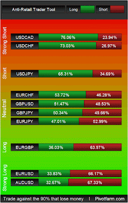 AUDUSD and EURUSD are building a firm position in the strong long zone GBP pairs with the exception of EURGBP are in neutral territory. Today we have Construction PMI at 4:30 am EST, if this event results in a strong deviation from consensus its likely that we could see some changes in retail positioning.