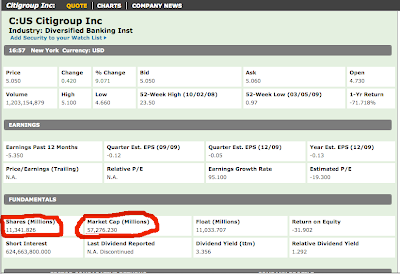 Wow, 20b shares times $5, a market cap of $100b! Soon Citi might use the stock to buy some oil wells or gold mines, or make a hostile bid a la AOL for "Time Warner". Any European or Japanese banks flushed with cash for an M&A? I bet Gold Men or JPM would be able to advise Citi on a deal before they find out what the Citi shares are worth.