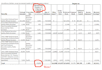 I believe after all C preferreds are converted and issued there will be approx. 23 billion common shares outstanding ($121B market cap) and approx. $40B in preferred's left outstanding including $18B the government will continue to hold. The private issue was also converted at $$3.25/share could probably be hedged at this point (since you can now borrow the common without a problem)