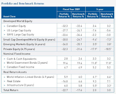 Speaking of changing benchmarks, I noticed something else going through PSP Investment's FY2009 annual report. When I took a closer look at their pathetic results, I focused more on how real estate significantly underperformed their Policy Portfolio benchmark, but something else caught my attention today. Look at the FY2009 results by asset class below: