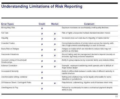 Until yesterday, the only real risk at the 5th branch of government (4th is the PIMCO/BlackRock two headed hydra) was making sure that 2009 is the year of the biggest bonuses on record (amusingly, now that Cerberus has all but followed Chrysler to its ignominious end (oddly missing from the company's industry expertise page - one would think the Dan Quayle-advised company learned more from this cataclysm than anything else), maybe Stephen Feinberg can sell the brand to the GS/PIMCO/BlackRock triumvirate and generate at least some recovery for its long-suffering LPs: the name would be so much more appropriate then). Now that that is taken care of, people can refocus on actually running the company (and running competitors into the ground). Conveniently, the presentation below allows readers a peek into the secretive areas of GS' risk management nether regions, and an overview of how the company positions itself in this riskfree (for GS; for others - not so much) environment.