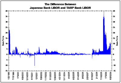 The charts below differ only in the date range. They show the difference in the average LIBOR rate for the three banks that have accepted TARP money (BofA, Citi and J.P. Morgan) versus the two Japanese banks (Bank of Tokyo and Norinchukin). We believe the Japanese banks are the farthest from TARP banks on the spectrum of government intervention.
