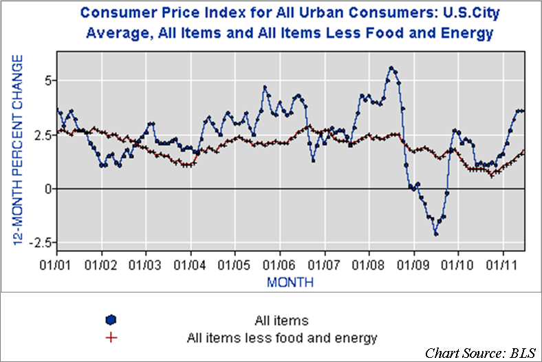 So bottom line this is a bad time to be investing in CDs based strictly on yield. But it gets worse when you factor in the cost of inflation which is running about an annual rate of 3% when you factor in food and energy, and will probably run in the range of 2.5% to 4% at an annual rate over the next two years depending upon fed policy.