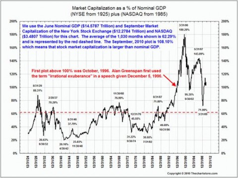 Quoting Farrell: “A return to the mean includes two extremes, not just one. One measure of valuation we consider valid is stock market capitalization as a percent of GDP. From the 1920s to the 1990s, it only went over 80% once (1929) but since has been as high as 180% in 2000 and as low as 72% in 2008. The current level of 110% is still high historically and only at a mid-level if you think history begins in the 1990s (see chart).”