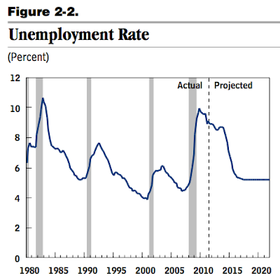Another central assumption that drives the results is the rate of unemployment. According to the CBO happy days are right around the corner. Unemployment will fall to 5% in just a few years and stay at that level forever. We should be so lucky.