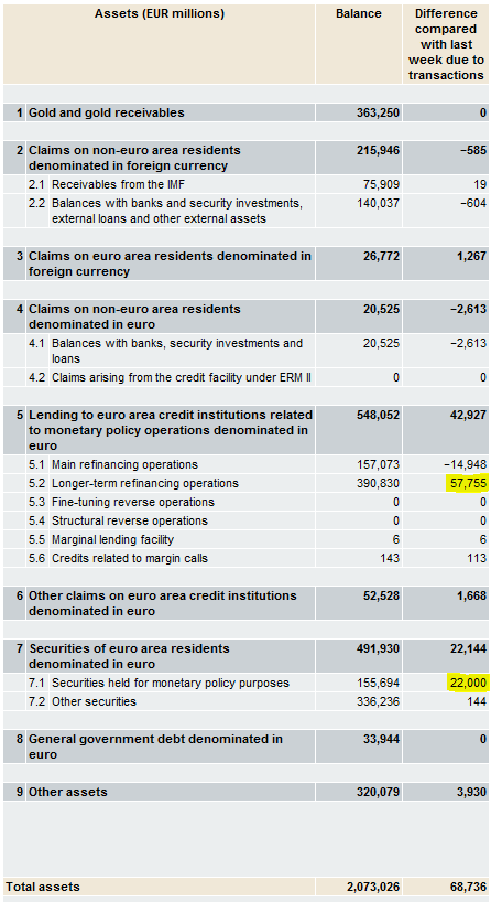 ECB's open market operations and demonstrates where most of the increase in Item 5.2 LTROs on the asset side of the balance sheet came from: