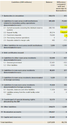 In the previous bond purchasing period, there would be a concurrent increase in line 2.3, "Fixed-term deposits", which are akin to short term non-negotiable bills the ECB would issue to banks to soak up liquidity [reductions in refinancing operations would account for the balance of sterilization]. Last week's increase in fixed-term deposits? Zero. Instead, there was a €54.6 billion reduction in the regular deposit facility at line 2.2.
