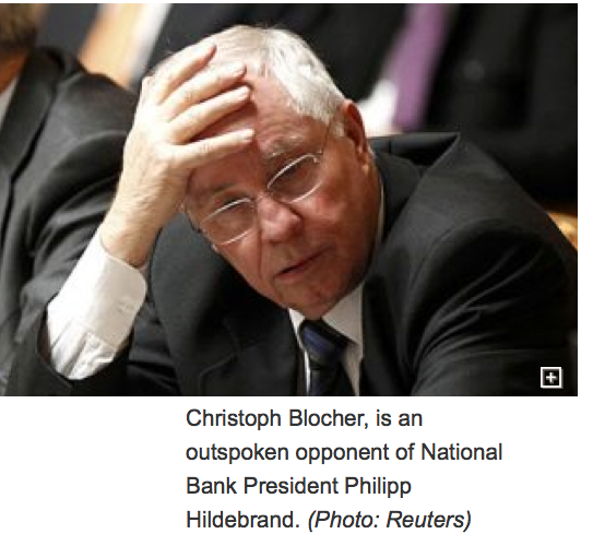 What's fascinating about this story is how it came about. Who blew the whistle on wifey?The answer is that Kashya Hildebrand maintained an account with a (very) private bank called Sarasin. When she did the trades back in August someone at the bank alerted an opposition politician, Christoph Blocher. Blocher brought the evidence to the Swiss President, Micheline Calymy-Rey and insisted on an investigation.