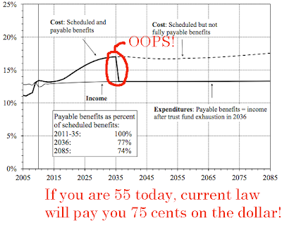 Anyway, I don't disagree that SS is a Ponzi and that it's going to collapse. But the situation with the disability fund is much worse. The report projects the fund will go below minimum safe assets in 2012 to 2013, depending on the model assumptions. They have a nice chart at http://www.ssa.gov/OACT/TR/2011/IV_A_SRest.html This seems really tragic to me. We're going to throw disabled folks to the curb? The weakest among us? (Meanwhile, what are those wars costing us?)