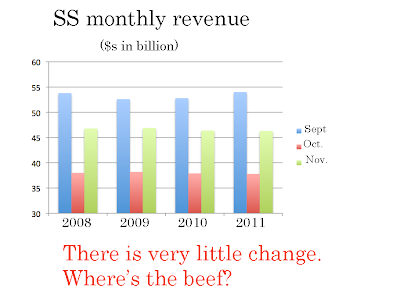 Social Security reports income from payroll taxes. The following looks at the September, October and November numbers for 2008 through 2011 (SSA has Nov. 11’ estimate out). You tell me if there is any evidence of improvement.