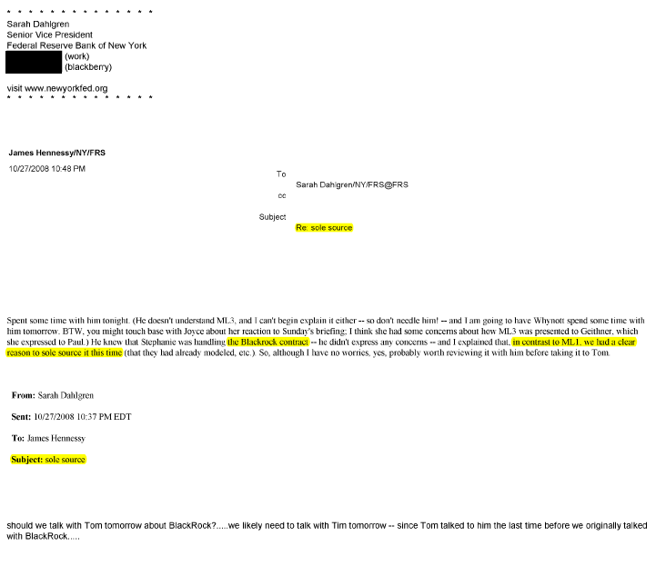 How did BlackRock get the job? According to an internal New York Fed email (original here) turned over to Congress at the behest of Daryl Issa, it was a no-bid "sole source" contract award (emphasis and brackets ours):
