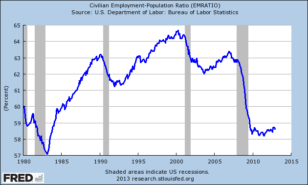 Why is the civilian labor participation rate (EMRATIO) persistently so low? It hasn't been this low since the early 1980s when it peaked lower for a very much shorter time. Don't forget, the federal government bailed out the banks, some insurance companies, GM, and Chrysler. Don't forget, the federal government also spent $878 BILLION in Stimulus and the Federal Reserve manufactured over a $1 TRILLION to buy government debt. Despite all this, the numbers are actually quite poor.