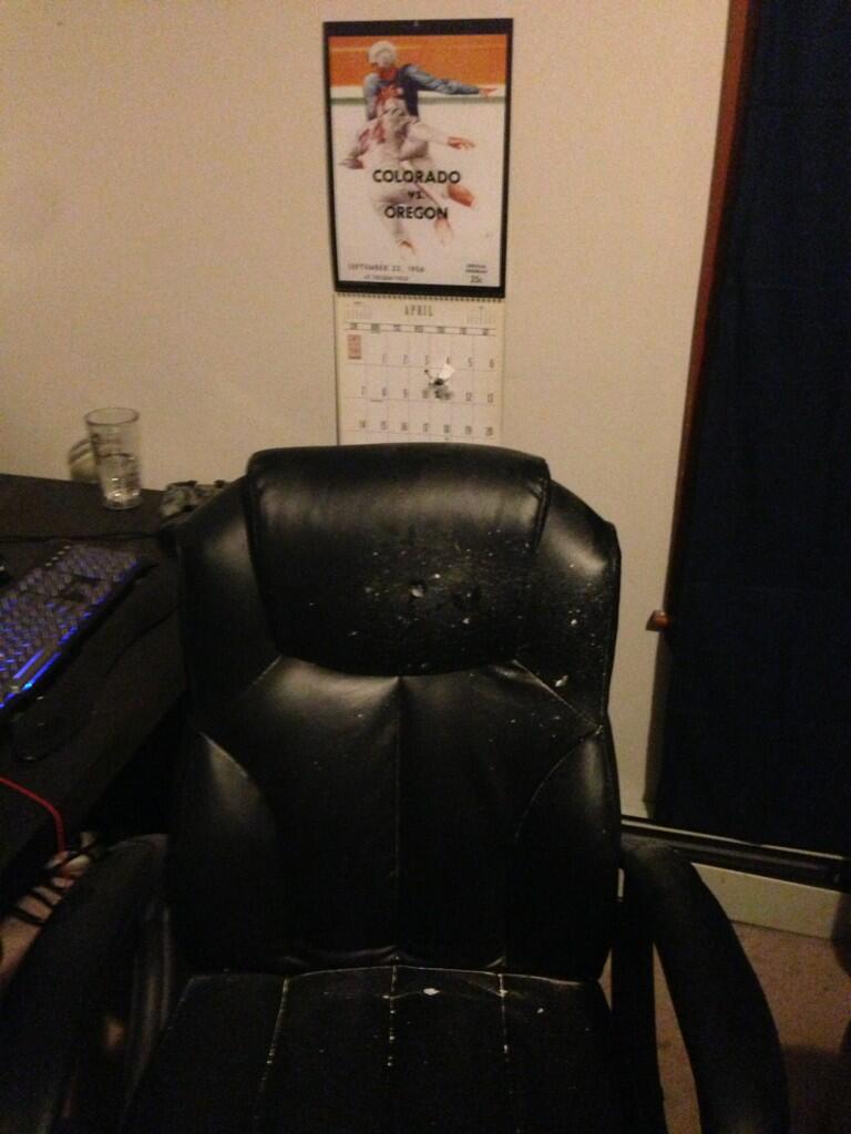 The dude's computer chair with a bullet through it and a hole in the wall behind it. Lucky he wasn't surfin the net at the time: