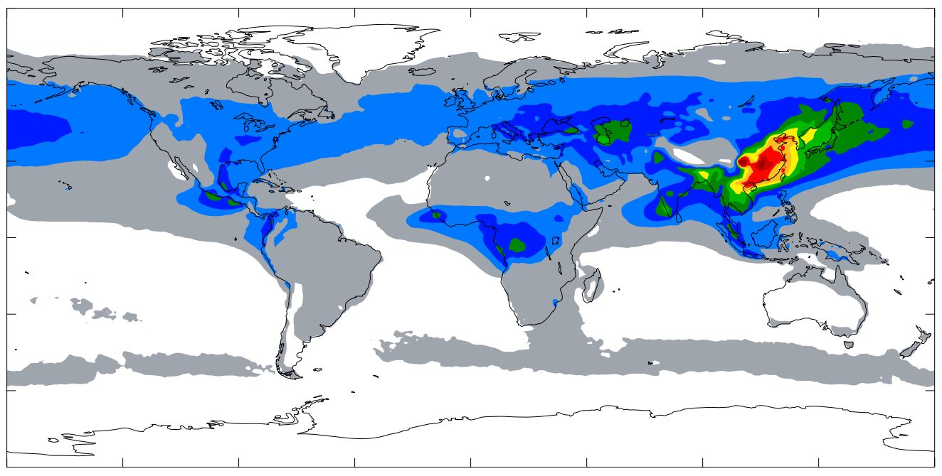 Bonus round! Global spring-time anthropogenic aerosol depth showing China's input. [source Warning PDF - via Early Warning blog, excellent info source]. Points if you can identify what's happening in Guinea / Sierra Leone. This amount of particulates is actually slowing heating, as are all those contrails the Infowars hebe-jeebees are so worried about ~ but given the amount of bad PR China is getting in Beijing, I happen to agree with it soon being a moment they'll enact clean air statutes. At which point, albedo goes down.