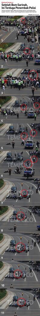 The attackers was seen with suspicions by the security guard in Sarinah building (its an old shopping complex actually and its not really famous nowadays but close to MNC offices); 3 guys were taken to the police post, and blow themselves up. Some other attackers which were free, use their handgun to shoot polices. Dunno why he didnt throw grenades at the masses.