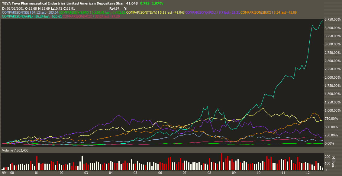 | $SPX (green), Goldman Sachs (blue), McDonald's (red), Apollo Group (purple), Teva Pharmaceuticals (yellow), Starbucks (orange), Apple (sea-foam green?) since 1999. |