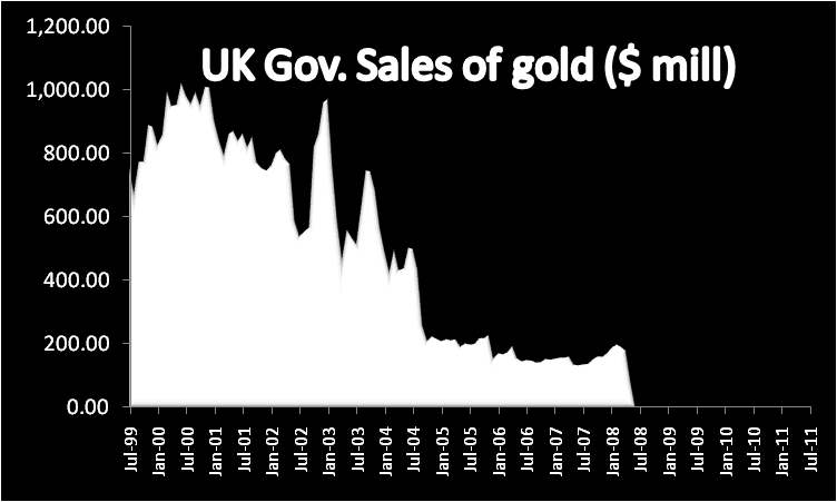 Before the down arrows start pouring in, let me say that I believe that gold and silver are real money. However, a dictator repatriating gold to cheering crowds is not positive for gold. If anything, it means that the "herd" has moved aggressively toward gold with a manic fever, and probably without any real understanding of gold's place as real money. In fact, many people are leveraging up on gold and silver in lieu of paying their mortgage or credit cards (kind of like Black Friday shoppers who never intend to pay the bill). In the minds of many, gold has become the sure path to riches as opposed to a store of value. With that in mind, government is part of the herd because they do what is popular among the people to retain power. Governments have been selling gold all the way up since 1998, and folks think that is a good sign. Unfortunately, it is a contrarian one. Until people abandon fiat cash for transactions and government relents on tyrannical monetary schemes, we are destined for boom-bust cycles in fiat vs real money. By the way, here is a chart of the UK selling gold from 1999 to 2008 to help make the point that government action is not a leading indicator.