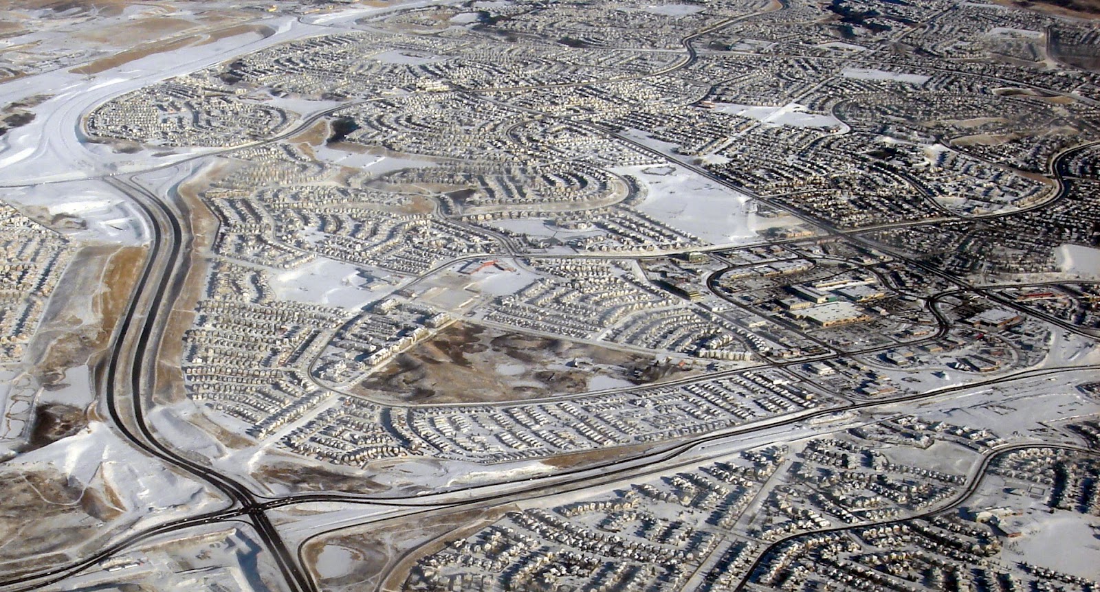 In tornado-prone areas, sprawl like that depicted above greatly increases the chances that houses are impacted by tornadoes. Similarly, sprawl into forested areas increases the likelihood of forest fires consuming the neighbourhood; sprawl up the sides of hills increases the likely impacts of landslides, etc.