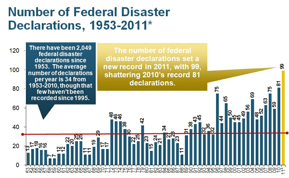 We see a steady climb in the number of US Federal disaster declarations over the past sixty years. Are we to conclude that there have been more disasters? Or is it simply that more people have been impacted by them? If so, why?
